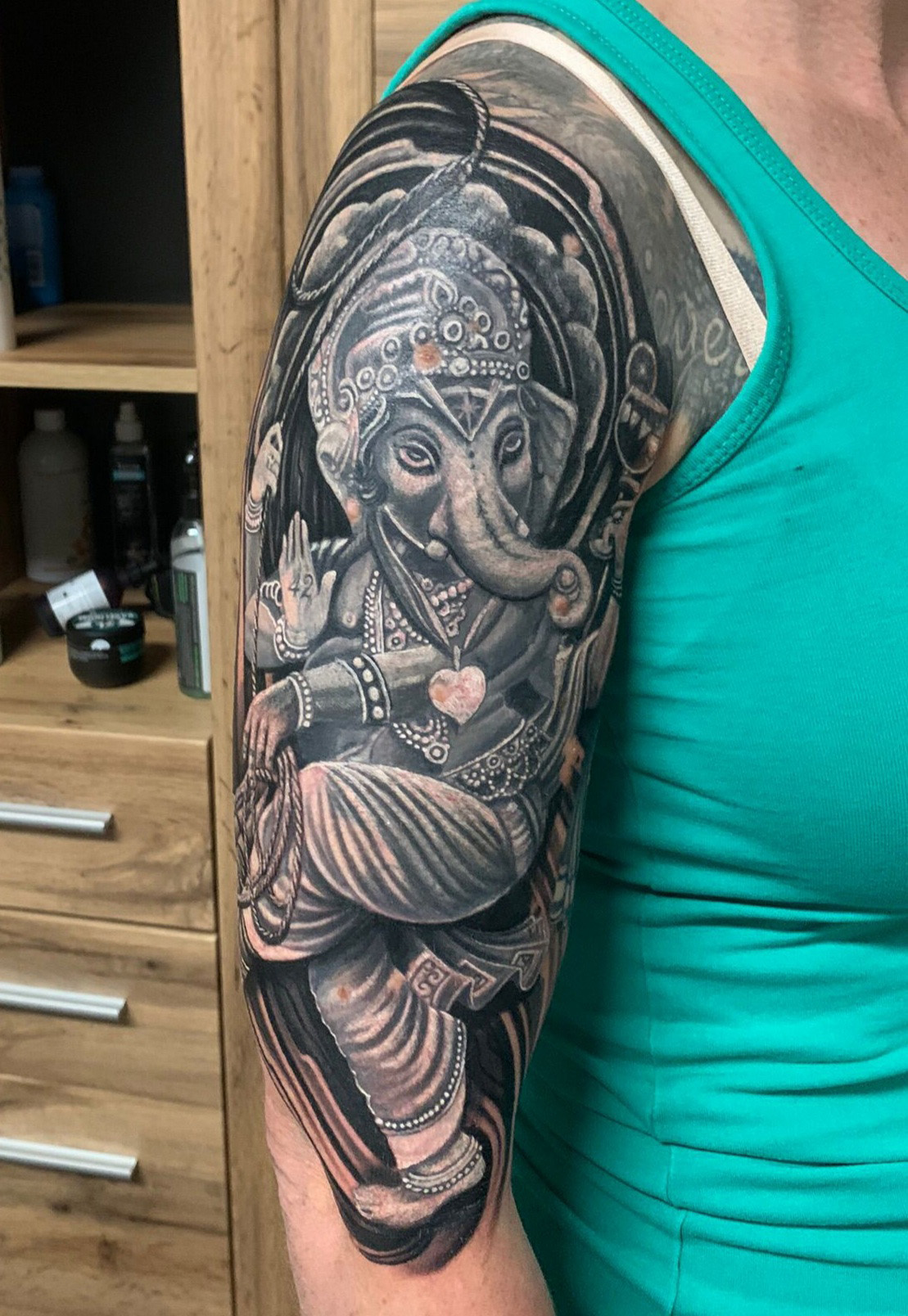 Nach kurzer Schlachtplanbesprechung mit dem Tätowierer meines Vertrauen war dann irgendwann klar, es wird der Elefantengott, der mir schon sehr lange gefällt und auch immer und immer wieder unterkommt.