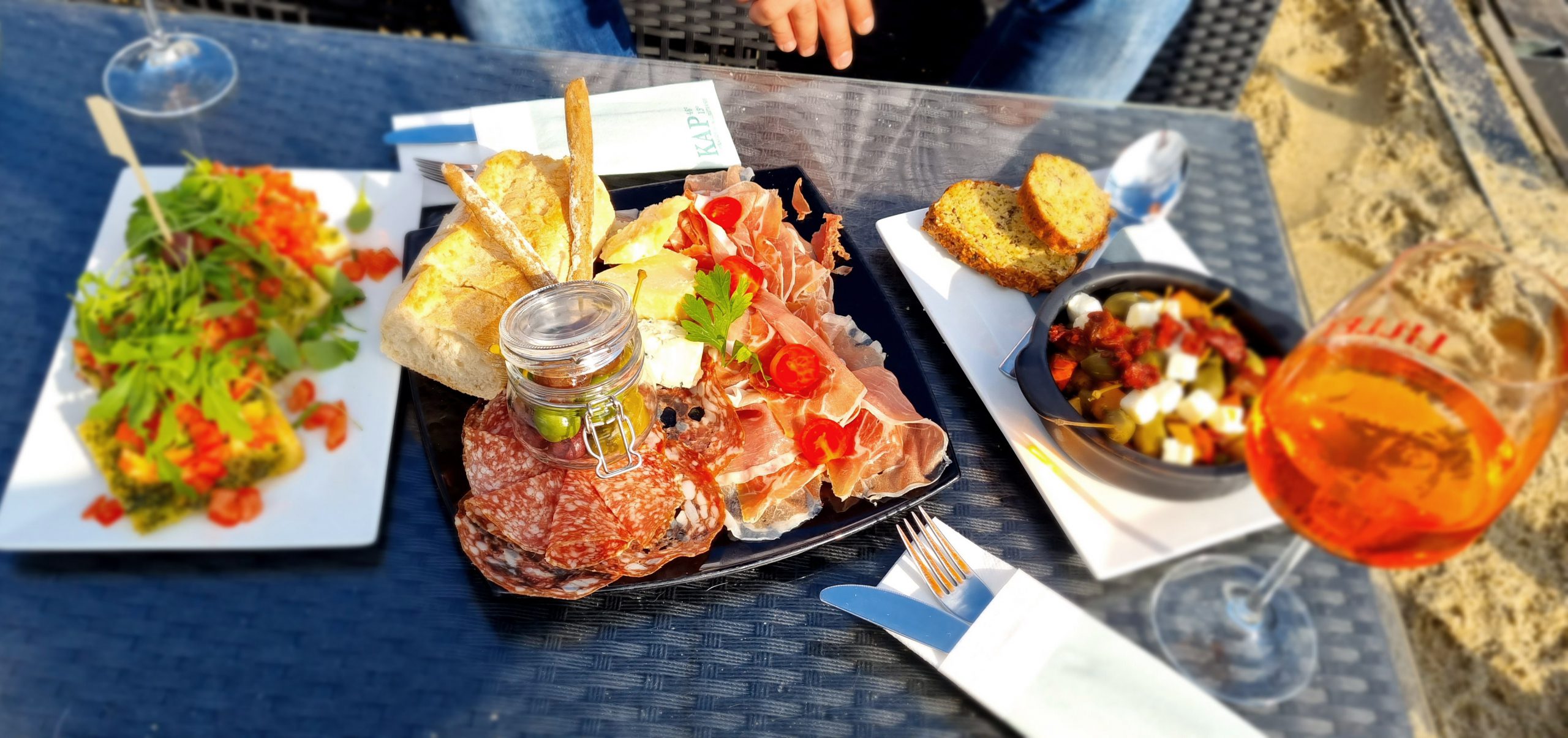 Ja und dann mussten wir uns leider kurzzeitig auch schon wieder anziehen, da das Abendessen nicht am Campingplatz sondern im Restaurant L’Onda im Badehaus für uns bereit stand.
