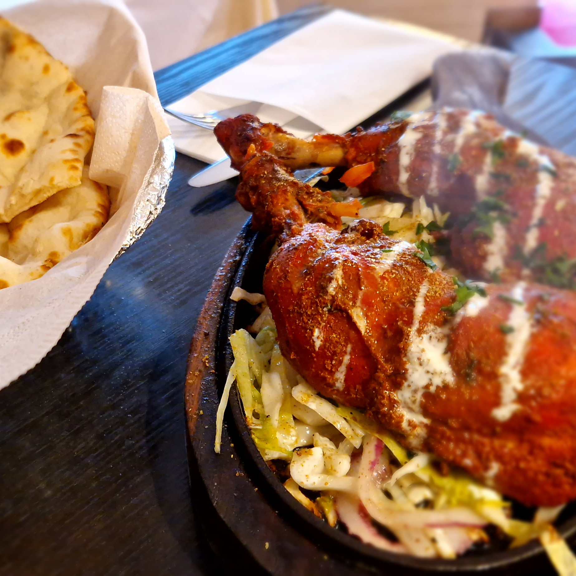 Hauptspeise: Tandoori Chicken mit Naan (auf heißer Platte)