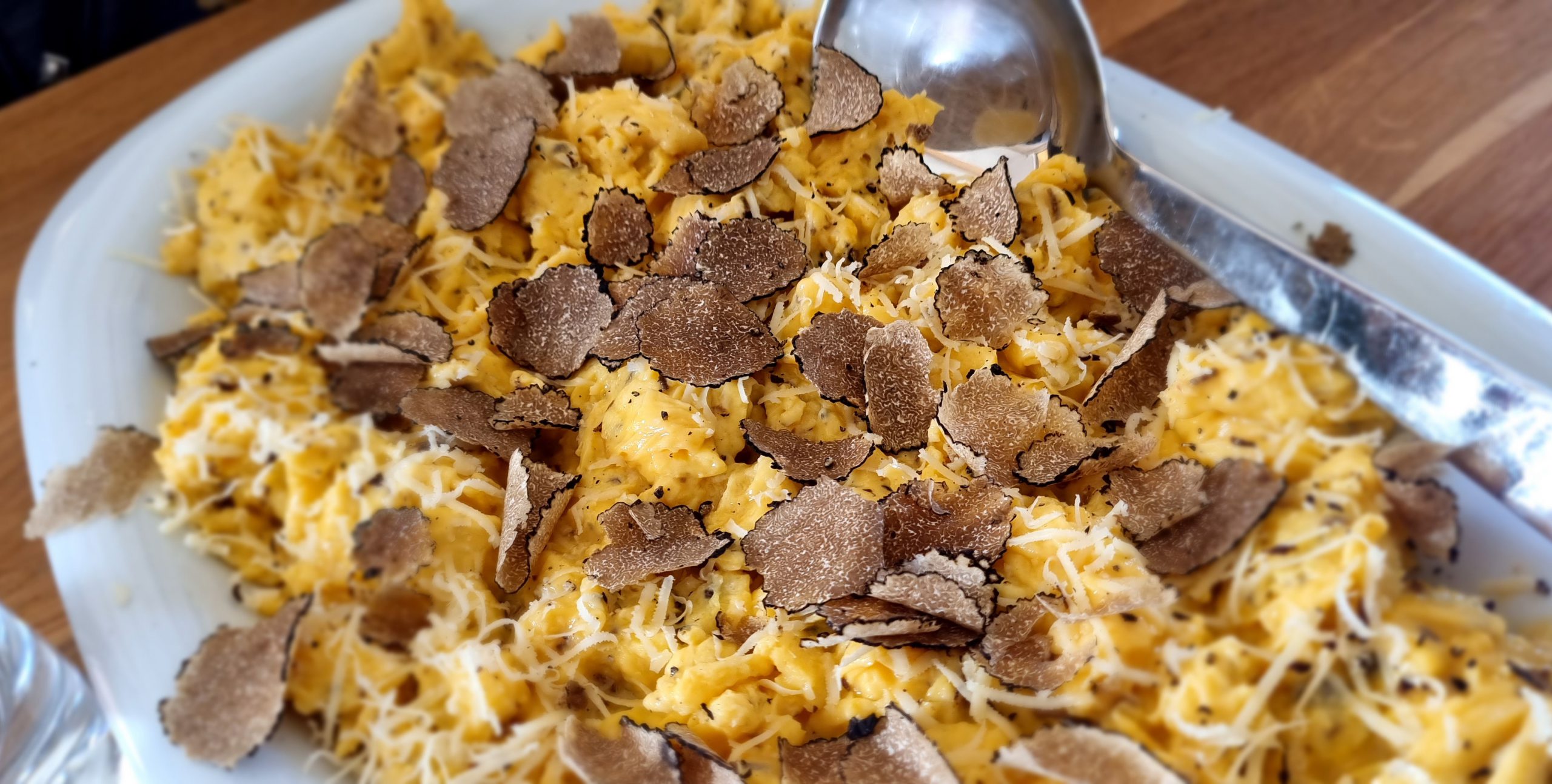 Ein echtes Highlight war auch die Trüffeleierspeis. Mirkos Mama hat geriebene Trüffel von Anfang an in einer Butter-Wassermischung mitgekocht. Auf meine Frage hin, ob die Trüffel dadurch nicht komplett den Geschmack verliert, erklärte mir Mirko, dass dies eigentlich das Gegenteil bewirkt. Genau diese Butter-Wasser-Trüffelmischung bringt das volle Aroma in die Eierspeis. Zum Abschluss wurde auch hier frischer schwarzer und weißer Trüffel darüber gehobelt.