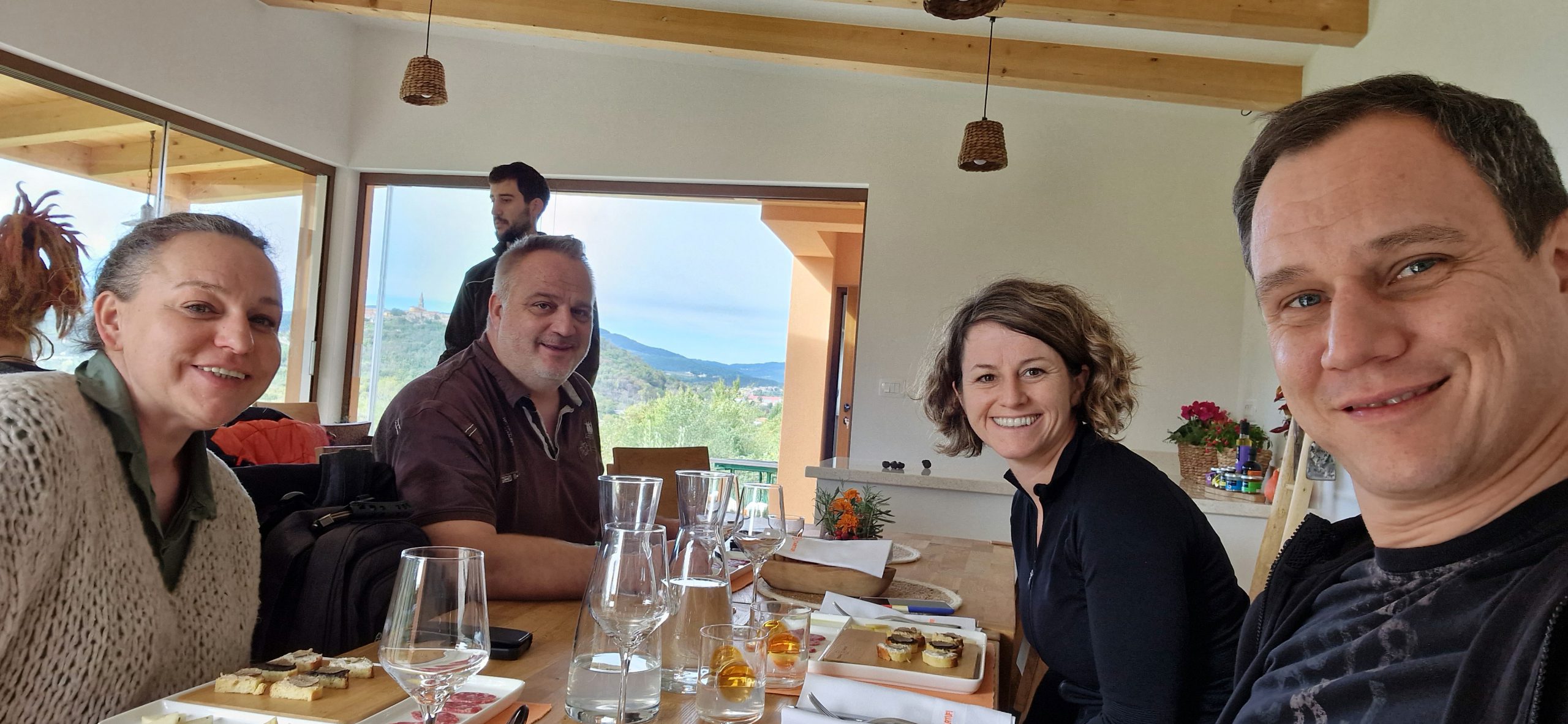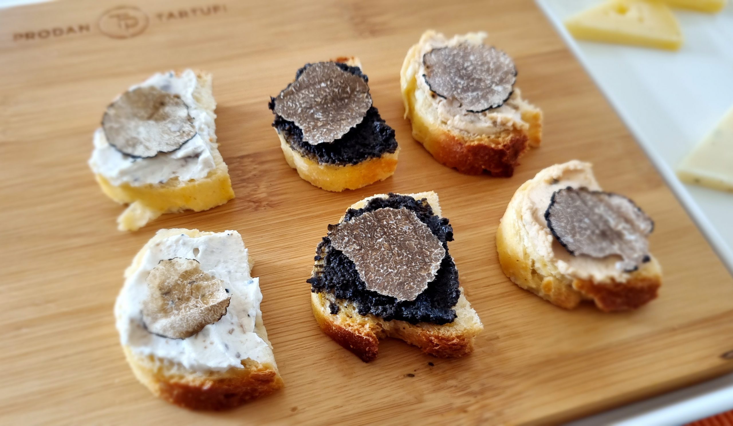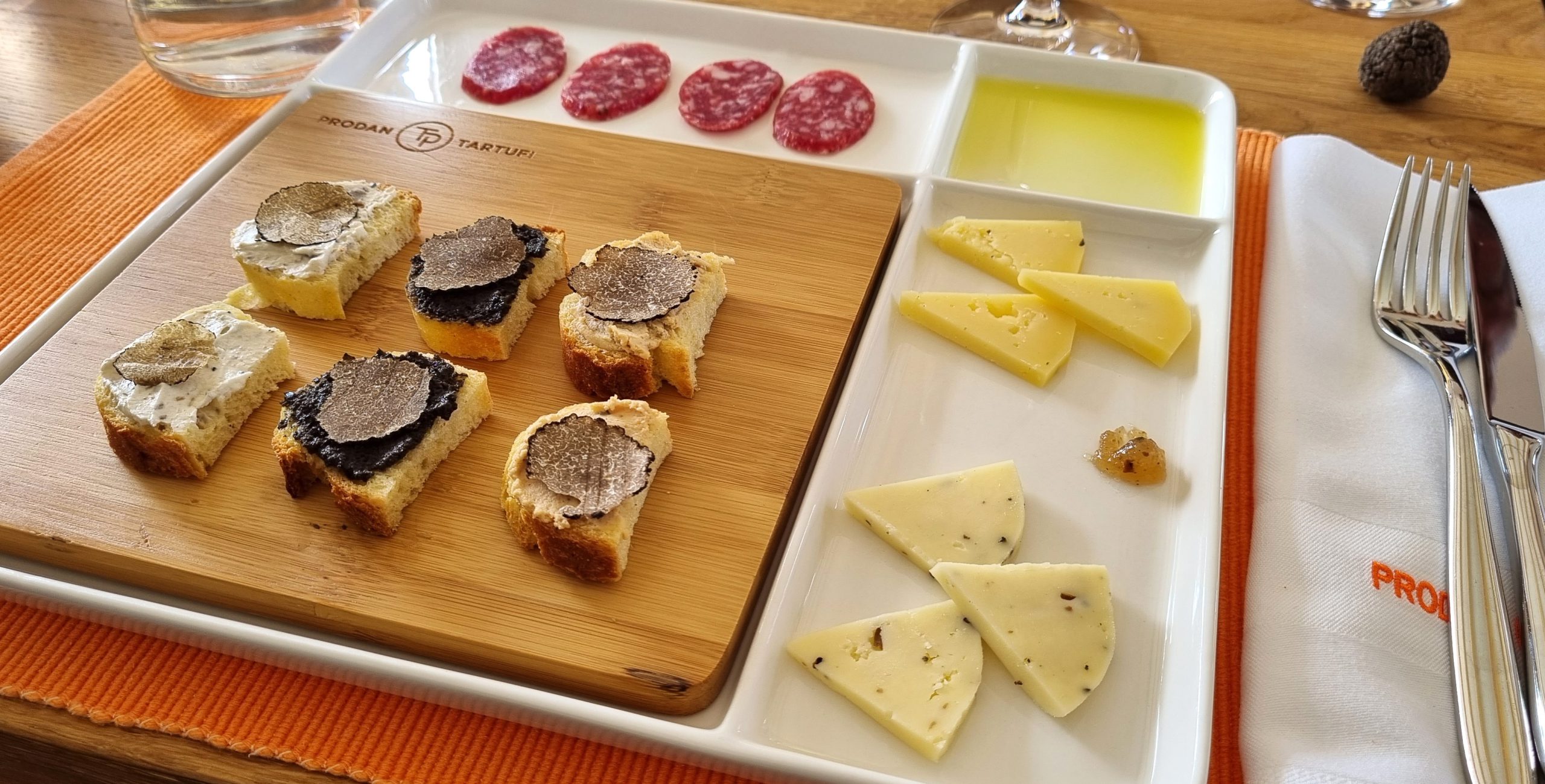 Zur Trüffeljagd der Familie Prodan gehört es dazu die Trüffel im Anschluss auch noch zu verkosten. Den Start machte ein richtig ansprechender Vorspeisenteller mit Trüffelsalami, Trüffelkäse, Trüffelpesto, Trüffelöl, sowie Trüffelmarmelade und drei verschiedenen Trüffelsorten. (ich glaube: weiß, schwarz und Sommertrüffel)